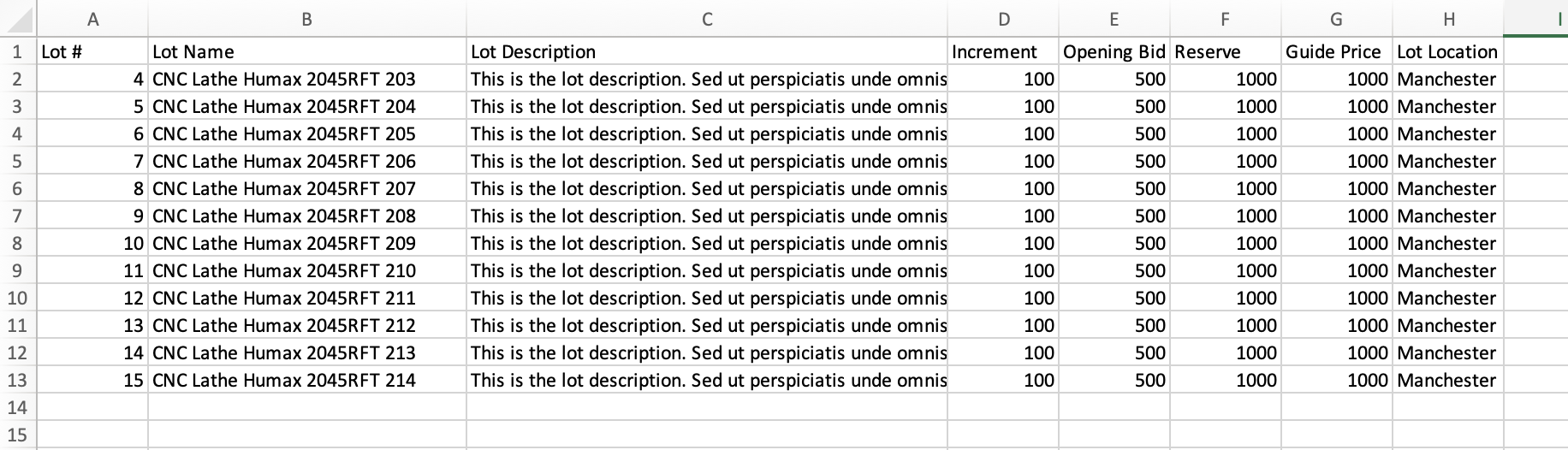 Each lot can be specified on each line of the spreadsheet. There is a column for the most commonly needed pieces of information. Fill in each one, line by line.&#x20;