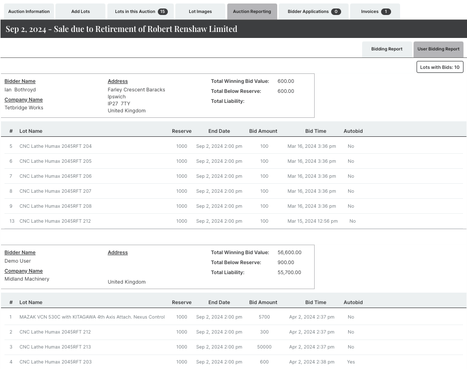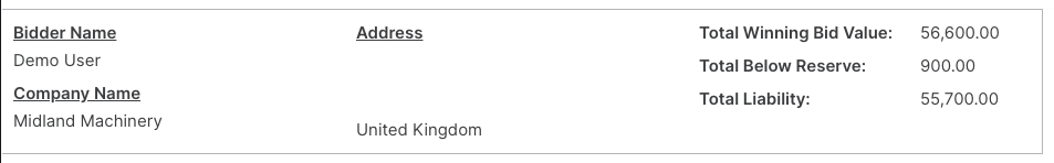 In the above summary, created for each buyer per auction, you can see how much they have committed as the current highest bidder on each lot. You will see their total bidding value, how much of that is below reserve, and the total liability.&#x20;